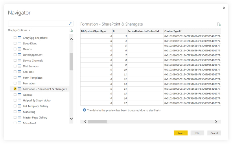در سمت چپ، پوشه یا لیست های موجود درشیرپوینت نمایش داده می شود که لازم است هرکدام را که نیاز دارید، انتخاب کنید. پیش نمایش داده های قابل بارگذاری در پنجره “Navigator” ظاهر می شود.