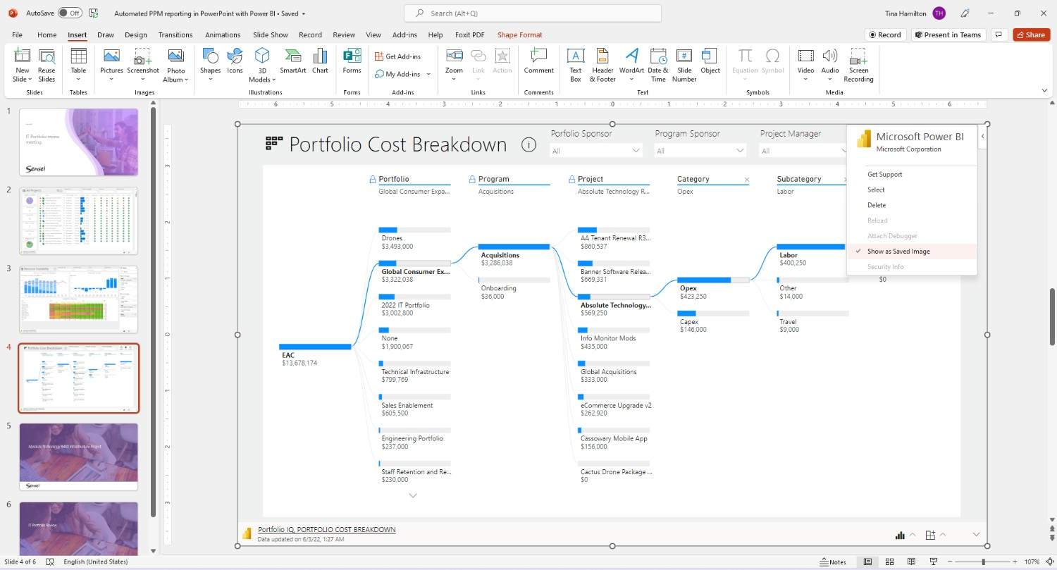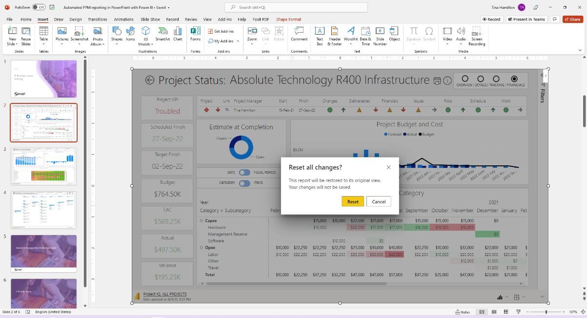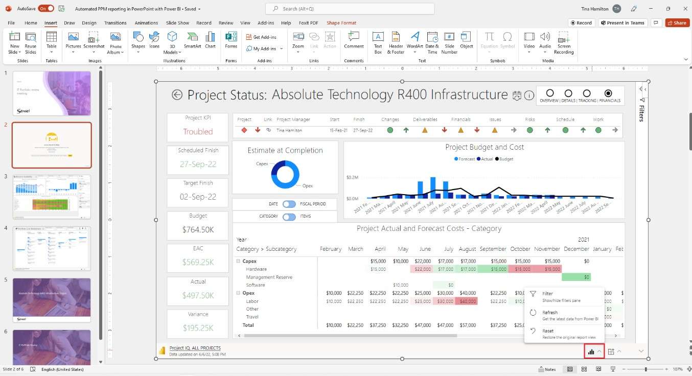 Figure 9 – Power BI Report in PowerPoint (Project Tracking)