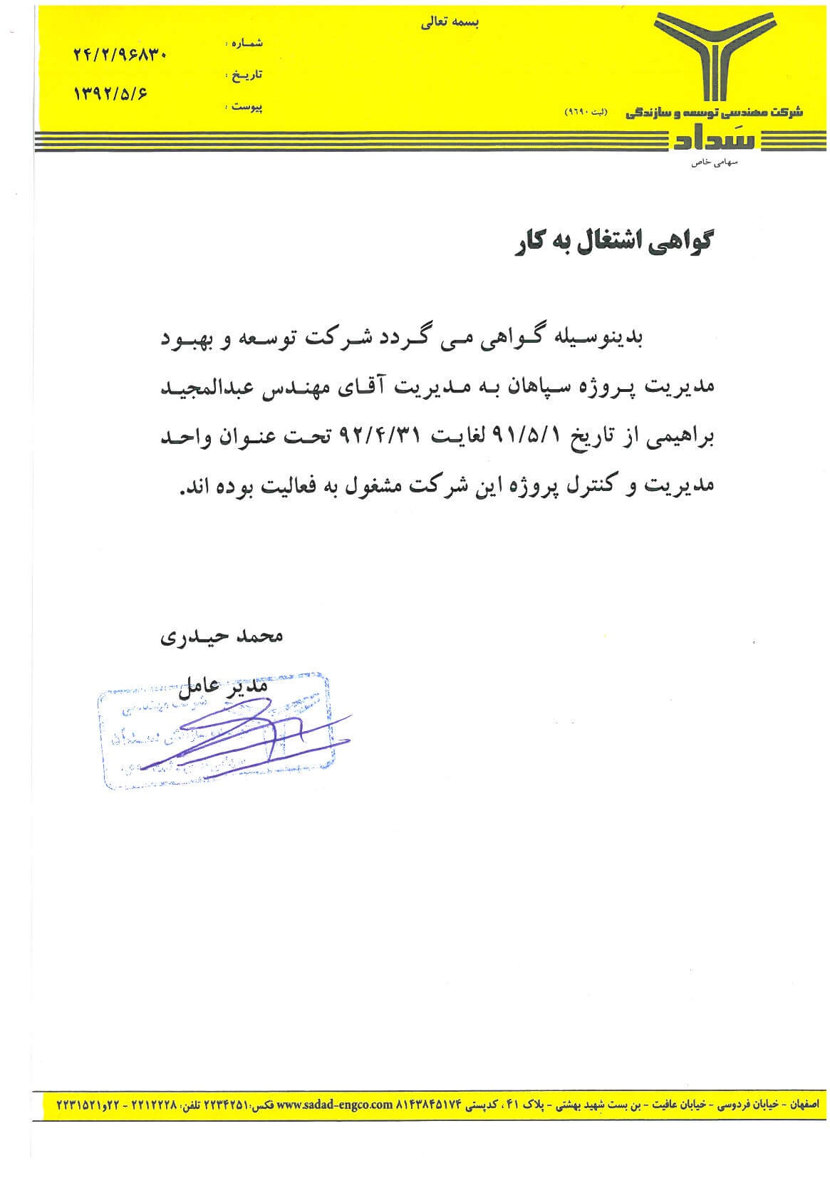 حسن انجام کار دریافت شده از سوی شرکت مهندسی توسعه و سازندگی سداد: